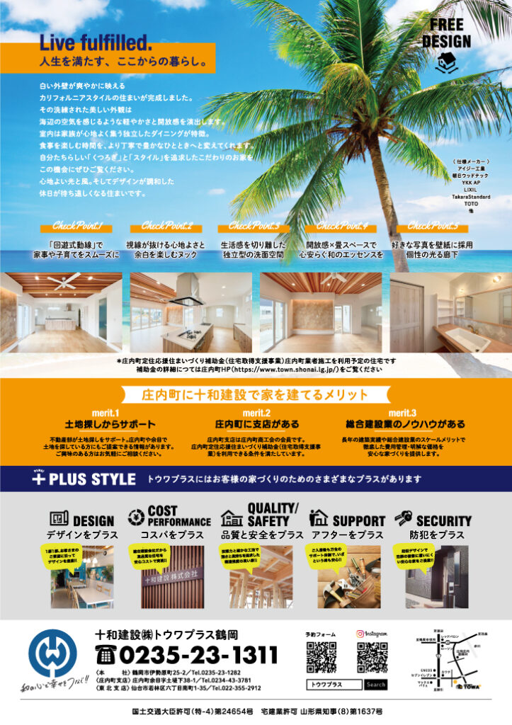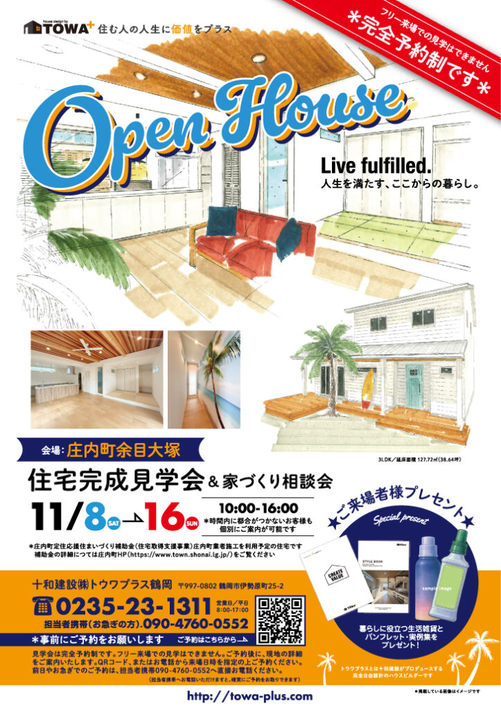 11月8日(土)~11月16日(日)、庄内町余目大塚にてトウワプラスの完成見学会を開催します。テーマは「Life fulfilled.人生を満たすここからの暮らし」です。お家づくりの参考に、ぜひご来場ください。