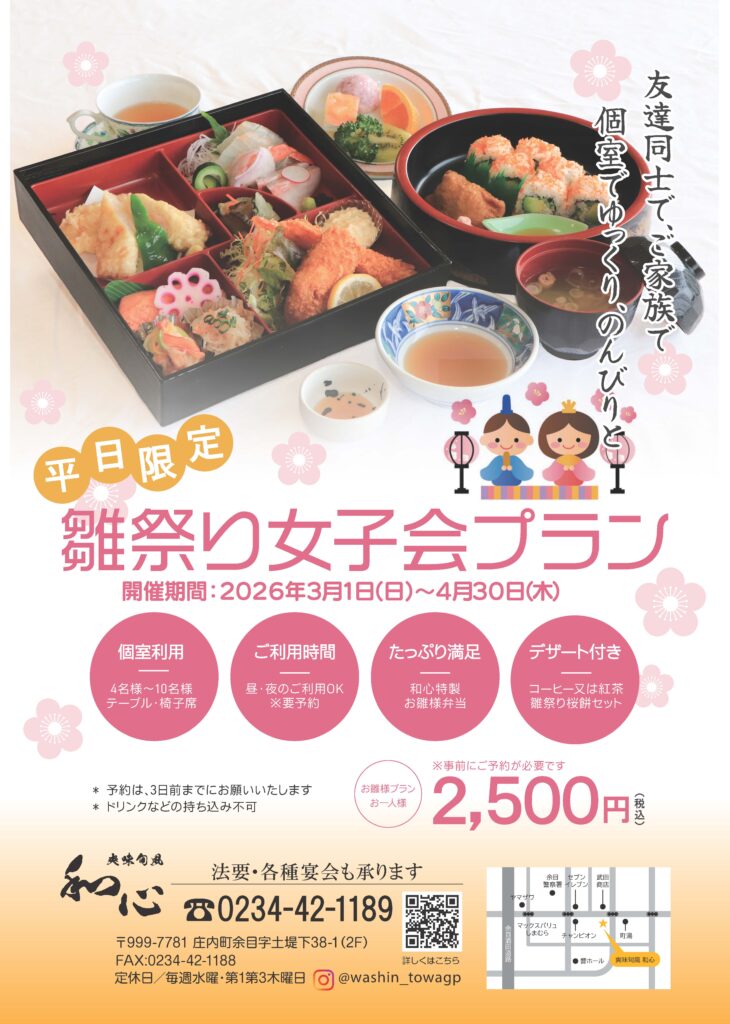 個室貸し切り和心特製お雛様弁当+デザート付きで2,500円(税込)のプランです。
